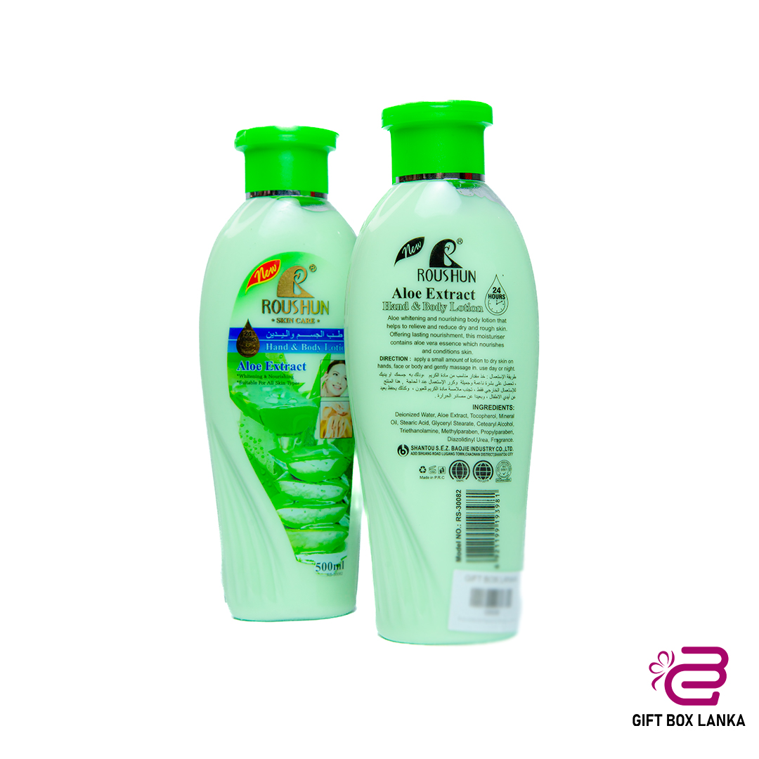 Keep your skin soft and hydrated with Roushun Aloe Extract Hand & Body Lotion. Infused with aloe vera extract, this lightweight formula moisturizes, soothes, and refreshes the skin, leaving it feeling smooth, nourished, and rejuvenated. Perfect for all skin types, it helps protect and restore skin’s natural moisture.